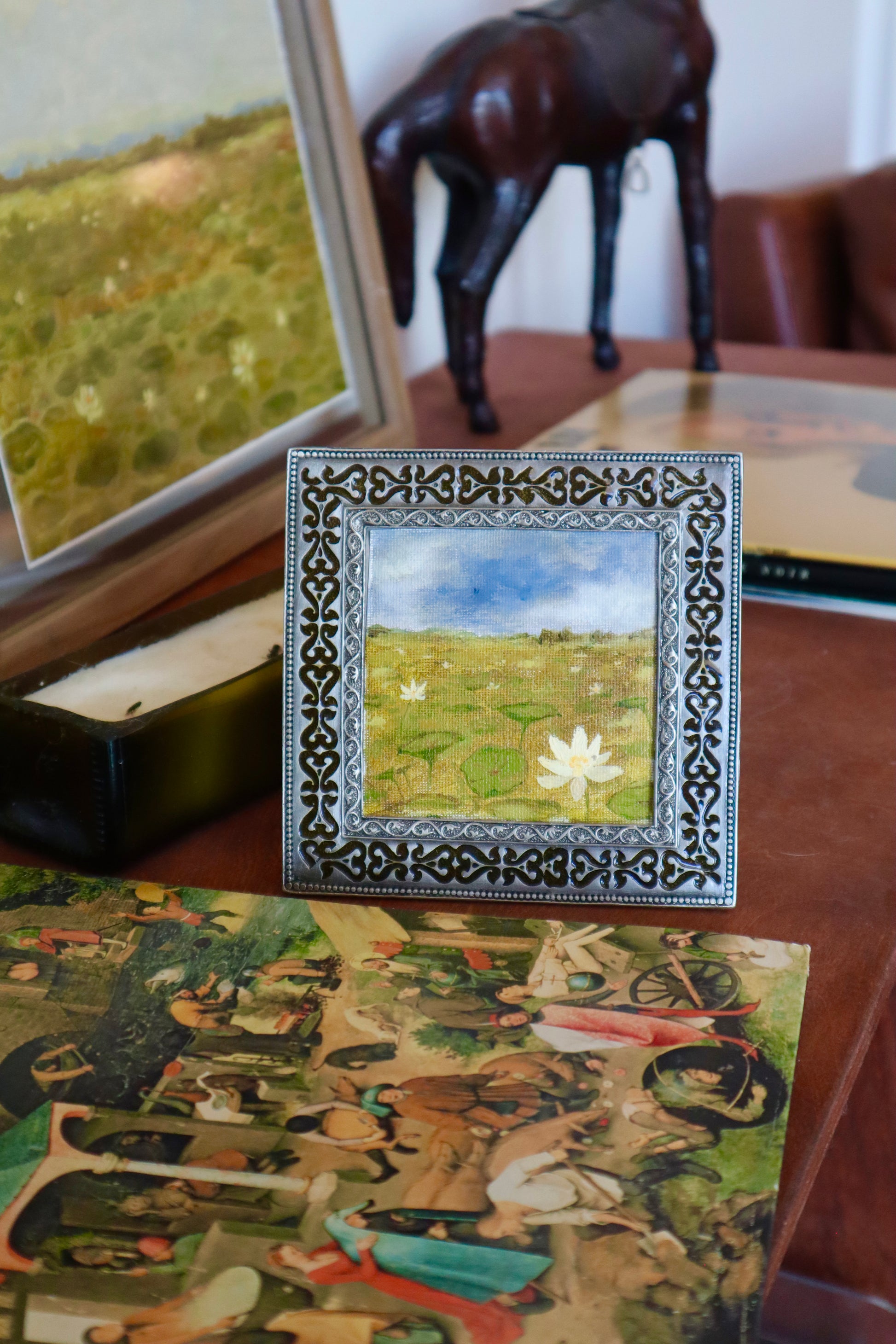 Summer rain approaching Dufrene Ponds. Antique ornate metal frame.